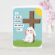 The front design shows a plump white bunny with soft rounded shapes, pink blush on its cheeks, and pale pink inside its ears, resting with eyes closed against a rustic brown wooden cross 🐰. The bunny’s relaxed pose and slight smile suggest a tender, trusting closeness, as if leaning into a steady companion. On the left side, three stacked white rectangles hold uppercase text that reads “...BECAUSE EVERYTHING COMES FROM THE LORD...,” set in dark lettering for strong contrast. The cross stands tall near the center-right, its wood grain hinted with simple shading and slightly uneven edges. Below, a green grassy foreground stretches across the bottom, adding a gentle outdoor setting. Above, a clear blue sky fills most of the background, keeping the scene open and calm. In the upper right corner, a partial yellow sun peeks in with small triangular rays, and a tiny 🌷 sits near the grass line.