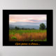 This poster features a magical play of light and colour on a hilltop at sunset. It had been raining all day. The sky began to clear just as the sun was setting. The foreground begins with a hint of green, then a layer of golden weeds, and then a field of ripening corn ending in a hedgerow of trees. Distant hills in the mist can be seen beyond the field. The partly cloudy sky creates a glorious pattern of pink, gold, yellow, orange, mauve, blue and white. This is such a lovely planet. Can't we "give peace a chance"?