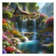 Peaceful mountain cabin waterfalls flowers photo print
