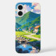 High-quality anime phone case depicting a serene riverside village with mountains and pastel skies. Calm and relaxing anime design perfect for fans of peaceful landscapes, nature, and kawaii scenery.