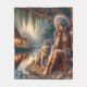 A native Indian woman relaxes by a tranquil river at dusk, adorned in traditional attire and a feathered headdress. Beside her, a majestic wolf sits calmly, adding to the peaceful atmosphere