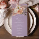 Enhance your reception tables with this elegant peach and purple floral wedding menu card. Showcasing delicate watercolor roses, pampas grass accents, and a soft lavender background, this design adds a romantic and rustic charm to your special day. Fully customisable to beautifully present your wedding meal selections.