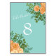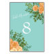 Peach Aqua Teal Wedding Roses Floral Table Number