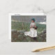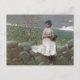 A fine art postcard with the painting, Peach Blossoms (1878), by Winslow Homer (1836-1910) an American artist from the realism movement. A young girl sitting on a stone wall near a flowering fruit tree with pink blossoms.