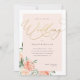Trendy floral wedding invitation featuring peach and cream watercolor peonies and lush greenery with a faux gold foil script against a blush pink overlay. Your wedding details appear in a simple, stylish typography.