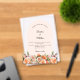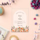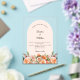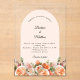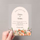 For an elegant and romantic wedding. A clear, transparent background decorated with orange, peach and pink florals. Arch shaped frame, ivory colored. Personalize and add your names and details.