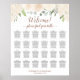 This 24 table wedding seating chart features a beautiful boho chic watercolor floral design with roses and blossoms in neutral pastel shades of champagne blush or very pale peach. The flowers are surrounded by a bevy of eucalyptus leaves and garden greenery. The elegant script calligraphy title reads "Welcome! please find your table" and the couple's names and wedding date appear at the bottom. This chart has table assignments for 240 guests with 10 seats per table, making it easy for your guests to find their seats.