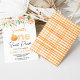 Sweet peach themed first birthday invitation for a baby girl featuring a lovely floral arrangement at the top and some copper colored dots. This peach themed first birthday invitation also features a large peach and watercolor letters that spell out the number one.