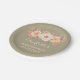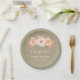 Customisable name baby shower party plates with rustic country burlap pattern and peach and light blush pink watercolor vintage flowers.