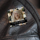 Celebration of life square funeral button featuring a stylish black background, elegant peach watercolor flowers, a photo of your loved one in a faux gold frame, their name, and birth/death dates.