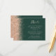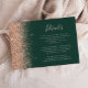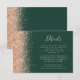 The left-hand edge of this elegant modern wedding details enclosure card features a peach faux glitter design. The customisable text combines pale peach handwriting, copperplate and italic fonts on a dark emerald green background. The reverse side features a matching peach glitter design.