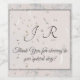 Design features an elegant peach and grey toned "marbling" effect as background to the shape elegantly displaying monogram of bride and groom in a silver-grey lettering. Customisable message of gratitude is displayed below monogram. The appearance of delicate ribbons and thrown rice overlay the design. Designed to accompany the "Peach and Grey Marble Wedding Suite."