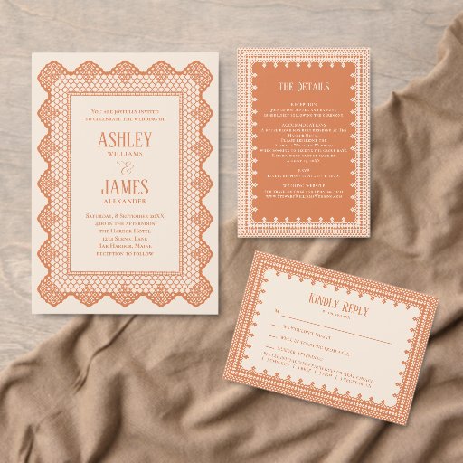 Complete your wedding suite with this coordinating peach lace details card, featuring the same delicate lace border and soft peach palette. The elegant frame provides a refined space for sharing accommodations, directions, dress code, and weekend events. Perfect for classic or vintage-inspired weddings, this insert keeps your stationery cohesive and beautifully styled.