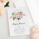 Sweet floral baby shower invitations feature peachy blush pink flowers and green leaves framing a blush pink banner reading "baby shower." Personalise with your baby shower details beneath in an elegant mix of block, serif and calligraphy typefaces.