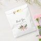 Elegant floral favour bags for bridal shower, baby showers or birthday parties feature a posy of peach and blush pink flowers adorned with lush botanical greenery. Personalise with three lines of custom text in chic calligraphy script and block typography; shown with "thank you," the event type or occasion, and the date. Designed to coordinate with our Peach Meadow event collection.