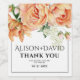 This wedding wine bottle label showcases an elegant design adorned with branches that are beautifully decorated with peach peony flowers and soft sage green leaves. The names of the couple are artistically displayed in an ornate typography, providing a unique and personal flair to the label. Additionally, a sincere 'Thank You' message is incorporated, all framed within a slender, delicate border that elevates the overall aesthetic of the design.