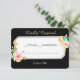 This pretty wedding response card features a watercolor bouquet of pink, peach, and pale yellow roses with greenery at two corners of a white banner. Your custom text is in black at the centre. Additional text fields are in light gold at the top and bottom of the card. All is placed on a dramatic black background, and the back of the card is also black. Appropriate for weddings in any season! This card matches invitations and other wedding products in our store.