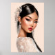 Peach Reverie is a striking editorial portrait designed to transform any wall into a gallery‑style showcase. With sleek black hair adorned by jeweled accents, shimmering eyeshadow, bold eyeliner, and vibrant crimson lips, this artwork radiates glamour and emotional resonance. The soft peach background adds warmth and balance, creating a modern yet timeless aesthetic.