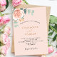 Peach coloured background. Decorated with a rose gold and blush pink floral, rose flower and green watercolored eucalyptus leaves, sprigs, greenery and faux gold sprigs. Personalise and add your names and wedding details.