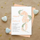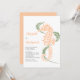 Peach seahorse with sage green seaweed wedding wedding invitation that features a peach seahorse and green seaweed while the names are written in a modern bold typography. This modern whimsical template design is perfect for a summer beach wedding. The back is of solid peach colour.