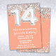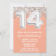 Peach and silver 14th birthday party invitation 14 birthday party invitation for a boy or girl with modern script writing and fun foil balloons.