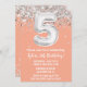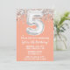 Peach and silver 5th birthday party invitation age 5 birthday party invitation with glitter and modern script writing and fun foil balloons.