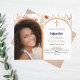 Add your own vertical size photo. A rose gold arch shaped photo frame. Decorated with rose gold, peach, beige wildflowers and a golden cross. Personalise and add a name and details.