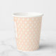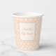 Peach Bow baby shower theme with cute typography and baby shoes on a polka-dot background. Square badge centre.