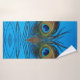 Bird face created from mirrored peacock feather images on a blue metallic background.