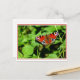 This postcard features a photograph of a beautiful peacock butterfly resting on foliage in a garden setting.