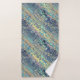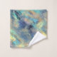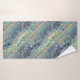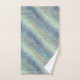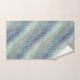 This set of three bathroom towels (each of which can be ordered separately) comprises a mix-and-match ensemble of varied patterns based on peacock colours: teal, aqua, turquoise, gold, and blue. One design displays rounded squares and circular forms; another shows soft, wavy, diagonal stripes; the third features a modern, scribbled plaid effect in the same colour scheme.