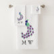 Bath towel set, consisting of a face cloth, hand towel and bath towel with a peacock design. You can customise this bath towel set with any text of your choice. Should you require any help with customising then contact us through the message link on this page. Peacock design bathroom towel set