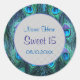 Elegant modern Peacock feather version in dramatic aqua blue and purple. Text says Sweet 15, with name and date information ready to be customised by you. This is version 2 of 2 with silver centre.