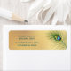 This wedding labels features a peacock feather on a gold background.