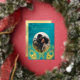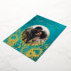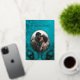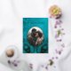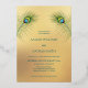 This elegant wedding invitation features a round photo surrounded by real gold foil peacock feathers on a shimmering floral turquoise background.