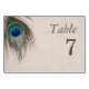 This table card matches the Peacock Feather Border Wedding Invitations, and other wedding products in our store. It features a blue, tan, and green peacock feather at the top left, with your custom text in brown at right. The images and text are placed on a distressed light grey tan background which complements the colours in the feathers. The back of the card matches the front.
