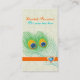 Peacock feather turquoise orange eye catching business cards. An elegant, sophisticated, stylish, classy design of a peacock feather in lime and emerald green, blue and orange, an orange band and an illustration of a blue heart jewellery diamond with gold outline with strass on ivory ecru damask background. Modern, yet classic theme with a light touch of vintage. Note that the heart diamond jewel is “printed on” and not a real crystal, so are the strass. For personal or professional use by designers, fashion, accessories or beauty business.