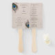 This wedding program fan features beautiful blue, tan, and green peacock feathers at the top left and bottom right corners of this wedding program fan. Your custom text is in brown and dark blue. The images and text are placed on a distressed light grey tan background which complements the colours in the feathers. The back of the fan has a matching background with plenty of room for your information. Be sure to see the matching wedding products, including invitations, in our store.