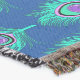 Throw blanket in a peacock feather textile print, executed in Adobe Illustrator an Photoshop - light aqua feathers, with an eye in shades of violet purple with aqua and black, on a deep cobalt blue background