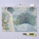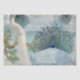 "Peacock Feathers Blue and White Crafting Decoupage Tissue Paper." Beautifully graphically designed out of a wide range of vintage artwork, ephemera and imagery, with a white Peacock and a blue and green full tail feathers showing Peacock over a pastel cool blue ephemera collage background. Created by internationally licensed artist and designer, Audrey Jeanne Roberts, copyright.