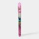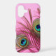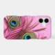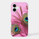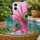 Make a bold style statement with this chic iPhone case design featuring exotic peacock feathers close-up. The iconic eye patterns shine in turquoise blue, emerald green, deep gold, and sapphire tones, beautifully contrasted against a light fuchsia pink background. Elegant yet vibrant, this trendy design adds a touch of luxury and glam to your everyday look.