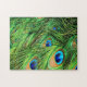 Peacock feathers difficult puzzle in green and blue. The Peacock is a beautiful bird with a very large display of feathers when he opens his tail to attract a mate. It is always the male that is gifted with the beautiful feathers.