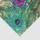 A collage of peacock feathers, a butterfly and gold scrolls over a green background.