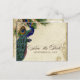 NOTE: this design is without the damask background. PAPER SELECTION: Postcards are printed on a very nice, very heavy stock that is glossy on the front side and matte finish on the reverse. COLOR PALETTE: Black, tan, cream royal blue, green, and rust. DESIGN: This antique vintage inspired wedding collection has a complete ensemble of products and can be created in several colorways. If you would like it to match your wedding let us know via email and we'll be happy to assist you. This design consists of a stately peacock on a tree branch vintage art element layered three peacock feathers and over an angel etching, swirls, antique handwriting, hand painted lace overlayed parchment and a beautiful original art damask pattern. The background colour can be changed to match your wedding.