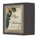NOTE: These are mini size boxes 3" square and 2 1/2" tall. The box is brown walnut colour, not black. COLOR PALETTE: silver metallic, tan, cream royal blue, green, and rust. DESIGN: This antique vintage inspired wedding collection has a complete ensemble of products and can be created in several colorways. If you would like it to match your wedding let us know via email and we'll be happy to assist you. This design consists of a stately peacock on a tree branch vintage art element layered three peacock feathers and over an angel etching, swirls, antique handwriting, hand painted lace overlaid parchment and a beautiful original art damask pattern. The background colour can be changed to match your wedding. Personalised with the bride and groom's names, perfect for bridal shower gifts, wedding gifts or to celebrate an anniversary!