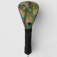 A golf head cover with a photograph of some detailed beautiful peacock feathers.