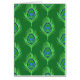 Note card in a peacock feather textile print - light lime green feathers, with an eye in shades of green, cobalt blue, and aqua, on a deep emerald green background