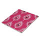 Ceramic tile in a peacock feather textile print, executed in Adobe Illustrator an Photoshop - pastel pink feathers, with an eye in shades of fuchsia, burgundy, coral pink, and black, on a deep fuchsia pink background