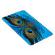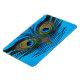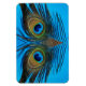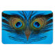 Bird face created from mirrored peacock feather images on a blue metallic background.