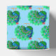 Party favour box shown in light blue with a cute cartoon peacock print.